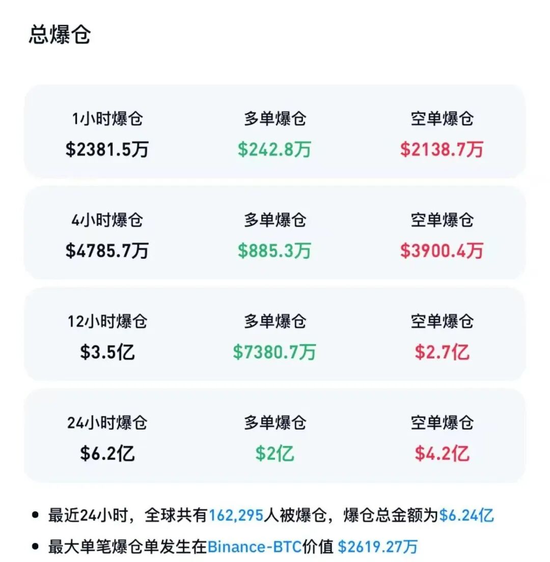 根据Coinglass数据,近24小时全球共有超过16万人被爆仓,爆仓总金额达6.24亿美元。