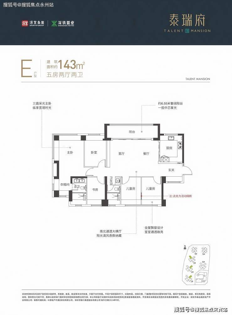 143㎡五房两厅两卫:横厅设计,客餐厅 6.55 米开间,五开间朝南,主卧带独立衣帽空间,得房率 77.48%(不含赠送)