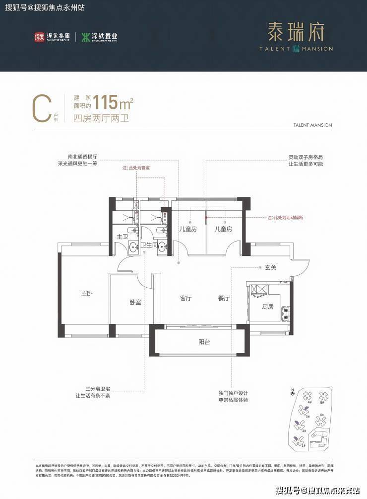 115㎡四房两厅两卫:横厅南北通透,客餐厅 5.85 米开间,四开间朝南,主卧南北通透,公卫三段式分离,得房率 77.48%(不含赠送)
