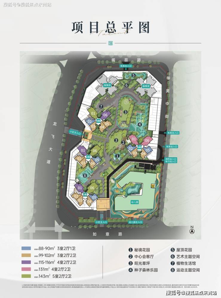 项目主推90-143㎡三至五房,均为全南向设计,采光通风优越。