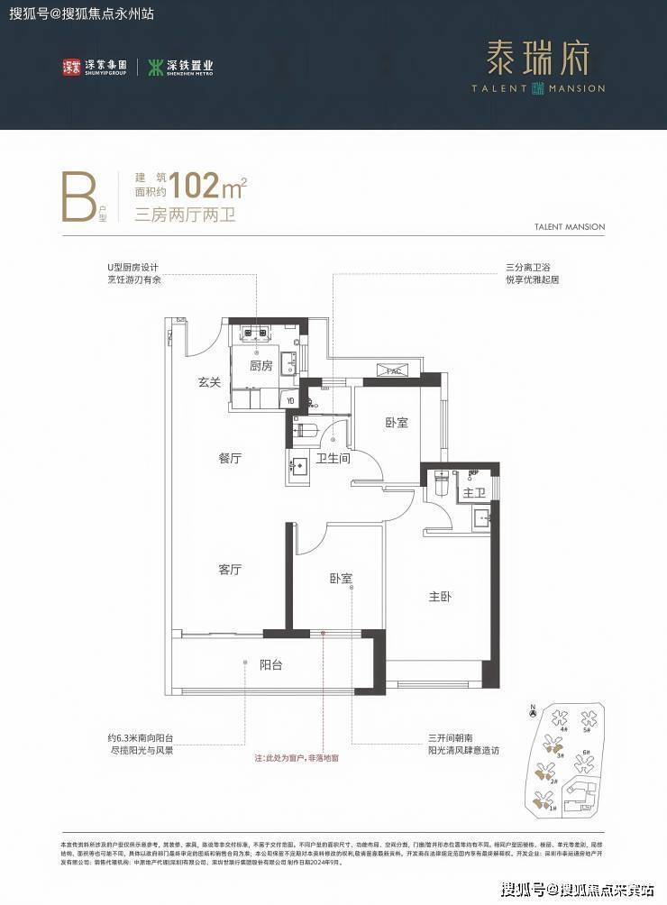 102㎡三房两厅两卫:竖厅格局,客厅 3.5 米开间,6.3 米阳台,三段式卫生间,得房率 77.48%(不含赠送)