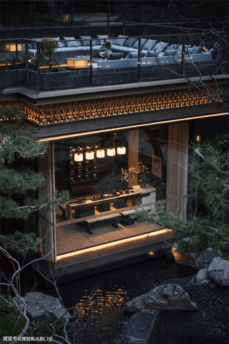 漫步于光影交织的幽静庭院,您将踏入一方充满诗意的天地。潺潺流水映照着婆娑树影,挺拔树姿为这片空间注入向上的生机,纵向延伸出无限的视觉张力。这座下沉庭院,不仅拉近了建筑与自然的情感共鸣,更使室内与景观紧密相连、和谐相融。每一扇窗户,都犹如框中的一幅生动山水画。