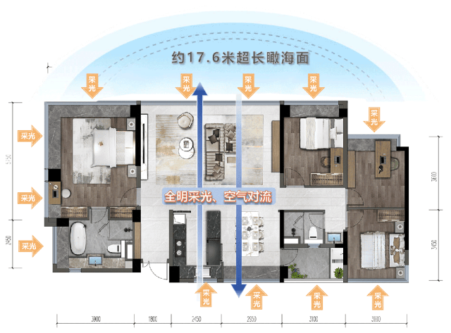 143㎡4房3厅2卫,五开间全明设计,整个户型拥有约17.6米超大面宽、12大采光面,享受“类板楼”的居住体验。