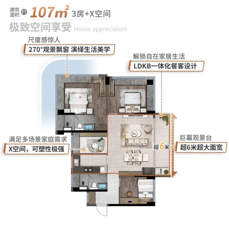 107㎡3+1房,满足家庭不同阶段的多种需求华发基于对众多家庭生活习惯的深刻洞察,设计了一款“3+1”房户型,拥有约11.4米超长观景面,为每一个刚改家庭“量身定制”。公区同样是LDKB一体化方厅的设计,U型厨房+约6米宽厅+阳台,强调互动和交流。