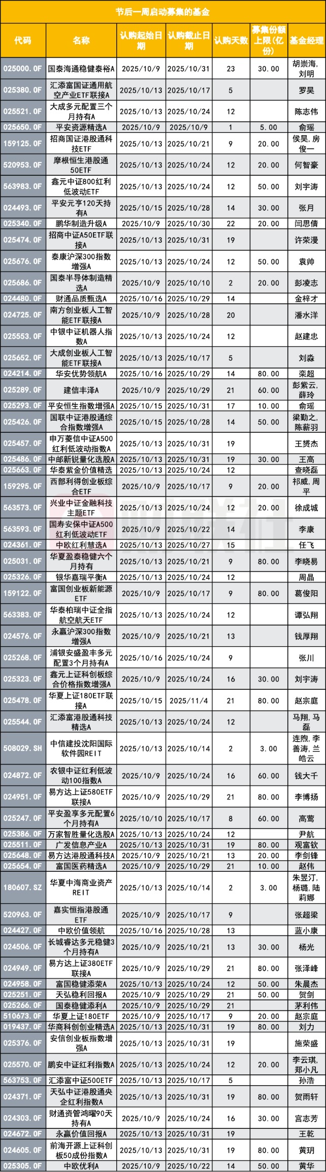从时间节点来看,十一假期成为今年基金发行的重要分水岭。据Wind数据显示,仅10月9日一个交易日,就有23只新基金开启发行;整个节后一周内(10月9日-16日),已有至少62只产品定档,展现出市场对年末行情的乐观预期。而在这批产品中,知名基金经理的挂帅无疑成为最大亮点。
