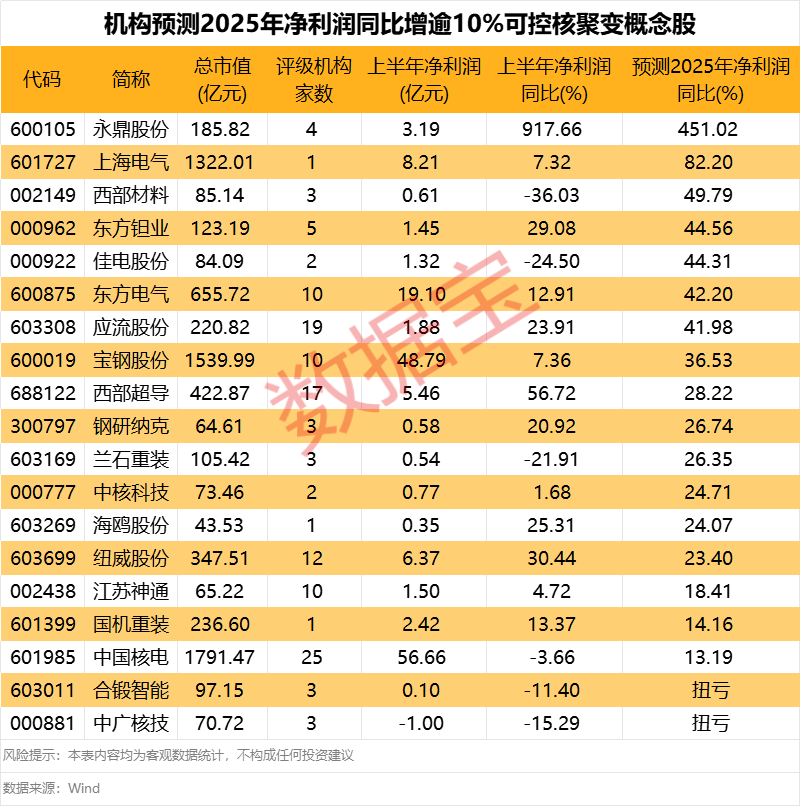 根据机构对上市公司全年盈利的预测,永鼎股份2025年净利润有望同比增长451.02%;上海电气全年净利润有望同比增长82.2%;西部材料东方钽业佳电股份东方电气应流股份全年净利润有望同比增长40%以上。另外,合锻智能中广核技全年净利润有望实现扭亏为盈。