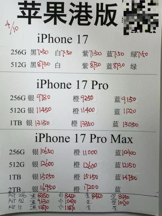 在远望数码商城,销售员老陈向蓝鲸科技记者出示的报价单显示,512GB版iPhone 17报价为7950元,同容量iPhone 17 Pro为10700元,而顶配2TB版iPhone 17 Pro Max价格高达17650元。尽管部分热门机型仍存在30至450元不等的溢价,但相比9月19日首发时全线溢价400–1300元的局面已明显回落。