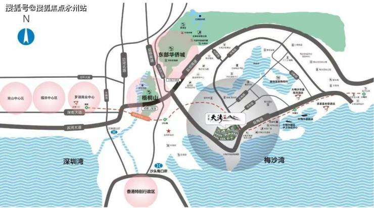 城市快速路,地铁八号线,15分钟罗湖中心,25分钟福田CBD,60分钟畅达大前海自贸区,从东部的海开往西部的湾。沙头角、莲塘双口岸一站式深港通行