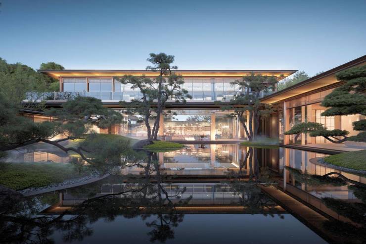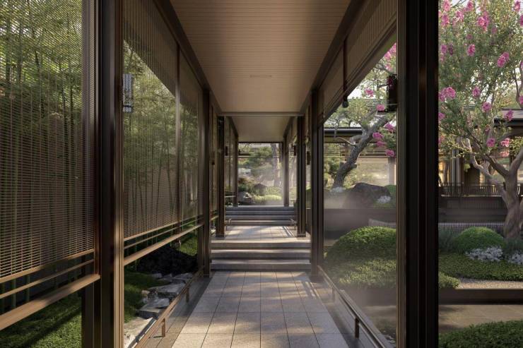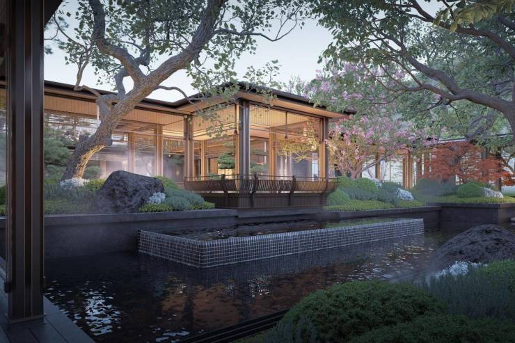 不论是“三进三迎”的归家礼序,还是“三轴七境”的山水序列,亦或是约46米宽的东方大门、对称的宫灯与树木点缀……整个社区都传递出浓郁的中式雅韵与现代质感。
