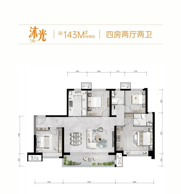 檀阅里143㎡户型,两梯两户从容归家、全明通透格局、双卫浴配置……宽境尺度满足家庭全生命周期的变化需求。