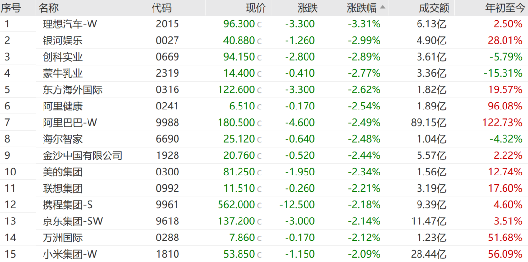 恒生指数成份股中16只上涨,71只下跌。理想汽车跌3.31%,银河娱乐跌2.99%,创科实业跌2.89%,领跌蓝筹。