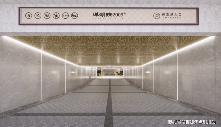 项目一期南、北车库入口采用”星空吊顶”装饰,南、北车库入口侧面材质设计为瓷砖,通行坡道选用防滑减噪且安全耐用的马蹄石,营造出如梦如幻的效果。