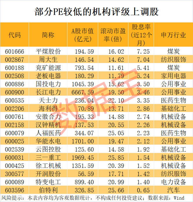 机构上调评级+低PE 18股上榜!股息率最高在7%以上