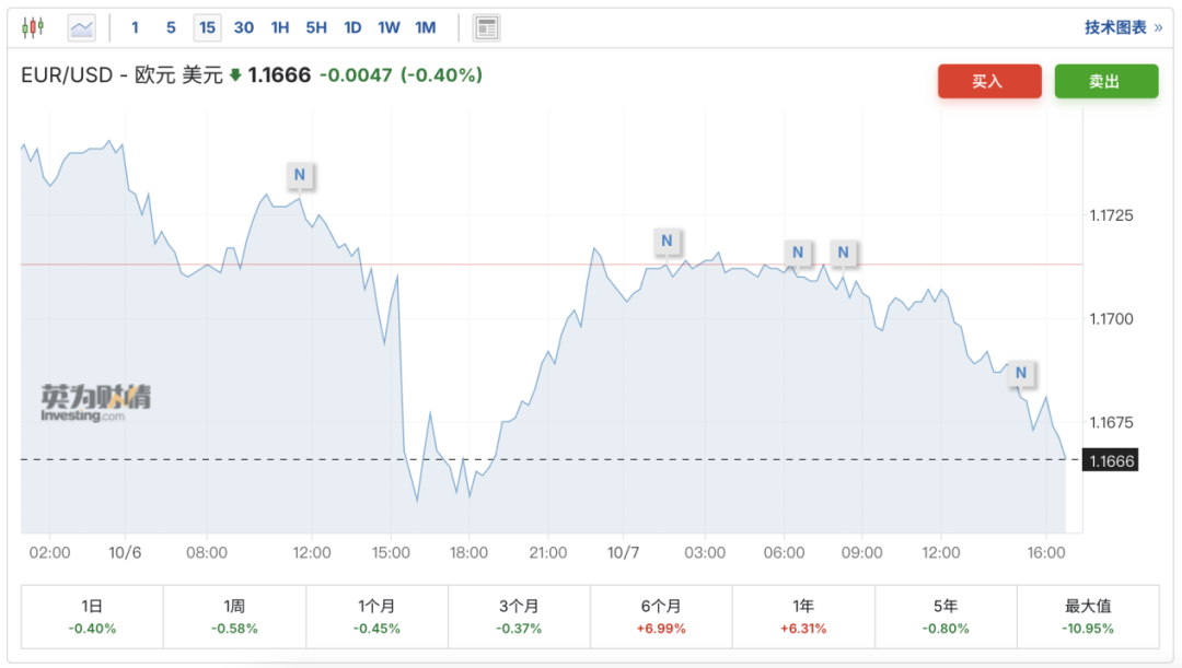 受此影响,投资者对法国财政稳定性的担忧急剧升温。法国国债市场遭遇猛烈抛售,10月7日,法国十年期国债收益率一度升破3.6%,逼近2011年欧债危机期间的高位。另外,欧元兑美元汇率持续下挫,现已跌破1.170整数关口。
