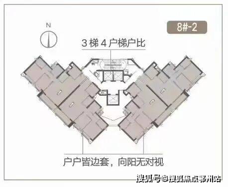 该楼栋是3梯4户布局,电梯集中排布,使用更便捷;