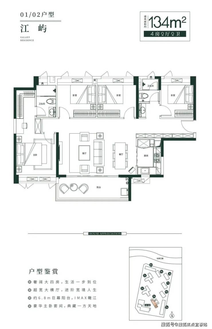 奢阔大四房,生活一步到位;超开阔横厅设计,进阶宽境人生;约6.8米巨幕阳台,IMAX瞰江;豪华主卧套间,典藏一方天地。