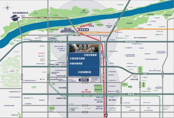 首创中心位于三环内,距离西安北客站1.2公里,片区内规划及在建多条地铁,公共交通及道路情况良好。