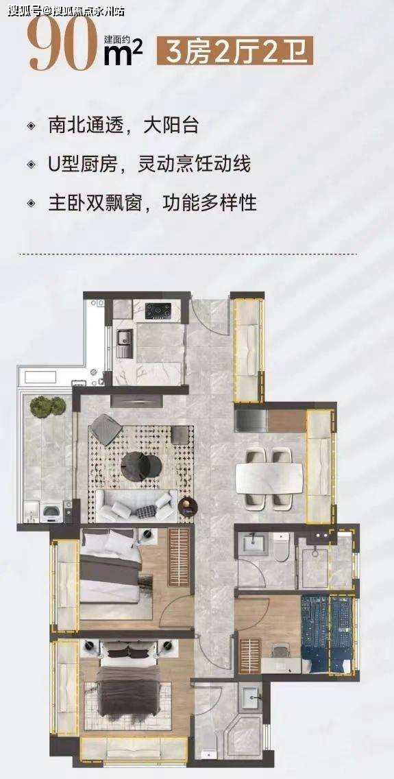 建面约90㎡奢阔3房】户型方正,整体格局通透朗阔,居住尺度更进一步。客厅双面采光,一面是大尺度观景阳台,一面是餐厅大飘窗。南北通透,畅享惬意自然,全屋七个凸窗,舒适度拉满,灵活空间布置,空间的使用率更高,主卧双大飘窗,270°无界室外风光,通透感十足,尽享舒适!