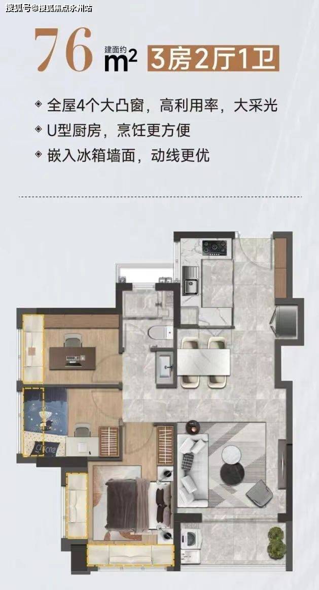 建面约76㎡精致3房】以小面积打造高实用户型,在有限空间里展现无限张力。客餐厨一体化,外连大尺度的景观阳台,灵动、阔绰,充分盛载全家人的娱乐休闲,厨房采取折叠窗设计,营造透明“开放式”厨房,隔绝油烟的同时,增强烹饪的趣味性。客厅预留当前流行的“S形”嵌入式冰箱位,房U型设计等,极致收纳,空间高效利用,居家生活更从容。