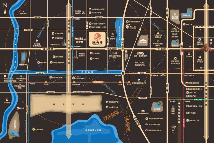三横三纵立体交通网络,距阿房宫立交约5分钟车程,到高新约25分钟,曲江绕城口约30分钟,到咸阳国际机场约35分钟。