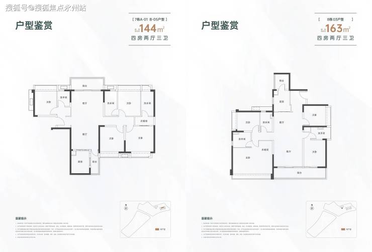 144-163㎡四房三卫(改善型)面积与配置:144㎡(南北通透)、163㎡(一梯一户)。