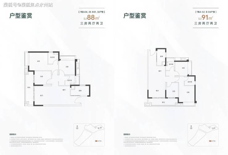 88-91㎡三房两卫(刚需型)两种相近面积段。