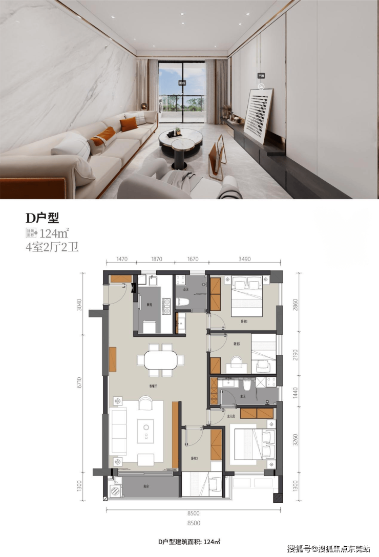 项目设有3个车行出入口及2849个停车位,5栋新房涵盖82-124㎡的二房至四房户型(文末可见户型图)。