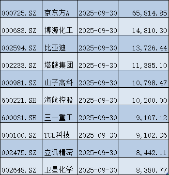 三一重工(600031)、TCL科技(000100)、立讯精密(002475)、卫星化学(002648)等,三季度分别增持了9107.12万股、9102.36万股、8442.11万股、8380.77万股。