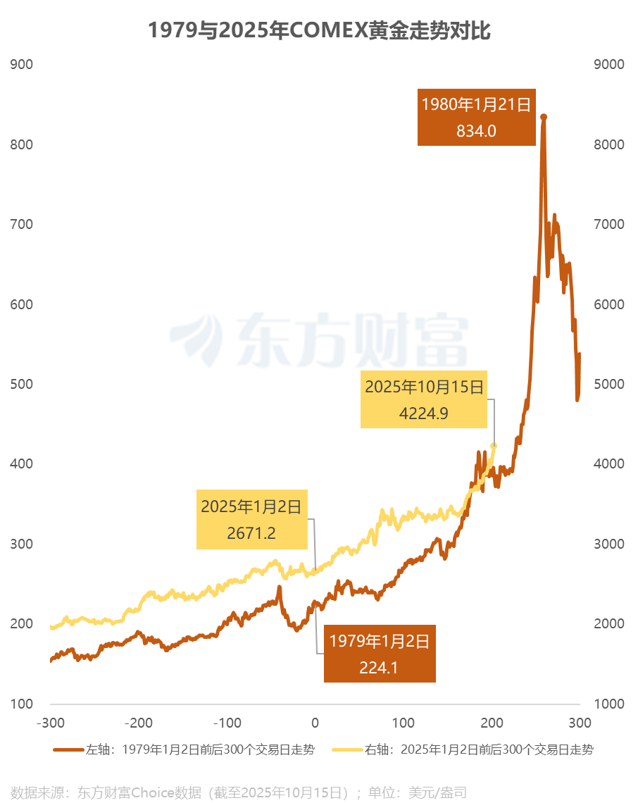 从全年迄今的走势看,2025年迄今的黄金走势,几乎有着与1979年完全相似的轨迹——黄金从9月开始涨幅明显放大,而1979年同样也是在全年最后四个月彻底爆发;