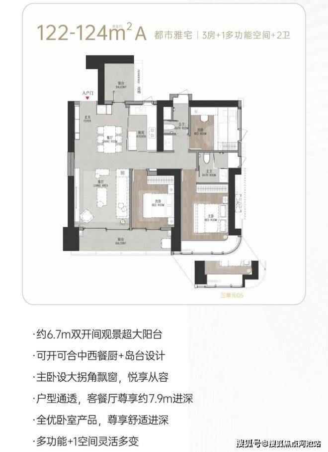 金地环湾城二期开盘加推户型,T 6 栋3单元(4 梯 6 户),本次首批推出T6共222套住宅,面积有约111㎡的3房和约122-124㎡的3+1多功能空间。
