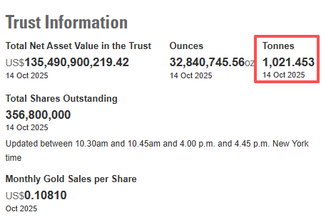 不止国内黄金ETF市场,全球最大的黄金ETF——SPDR Gold Trust的黄金持仓量近期也持续增长。官网数据显示,截至10月14日,SPDR Gold Trust的黄金持仓达1021.45吨,近一个月增加了44.65吨,近一年更大增148.93吨。