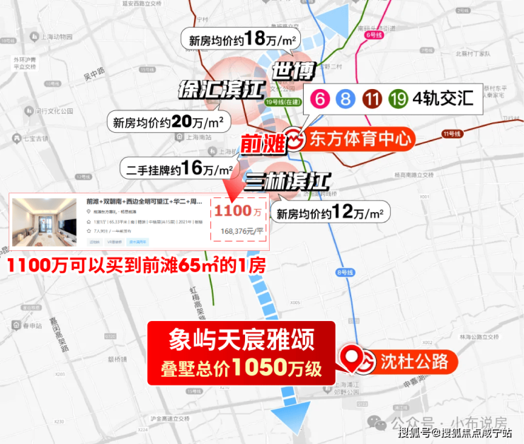 我们来看这条黄金轴的房价,世博新房18万以上,徐滨20万左右,千万预算似乎连门槛都摸不到。