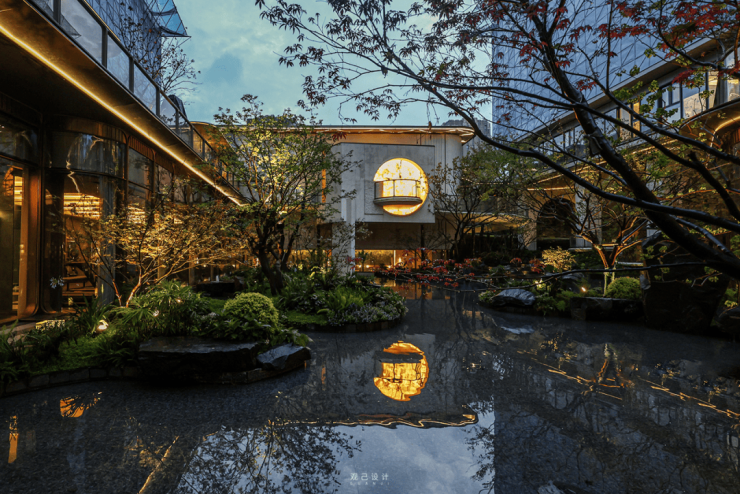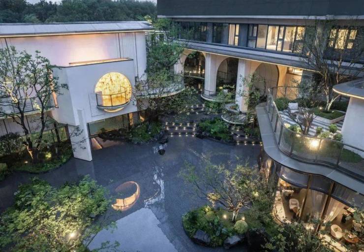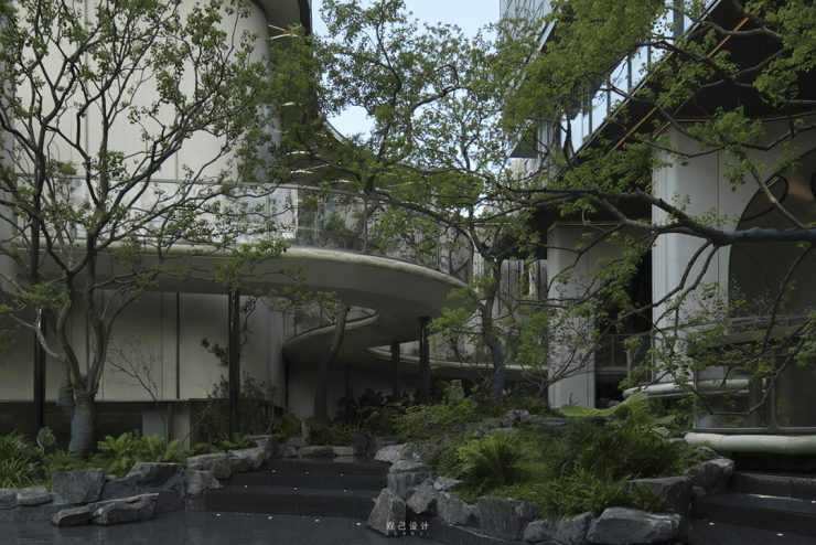 门楼内提取线条与门柱融合,仿佛是一股气韵将屋檐向上托举,提取自苏州砖雕窗花的形态,极致的线条交错下,在摩登感中融入苏州古建特有的灵动韵味。