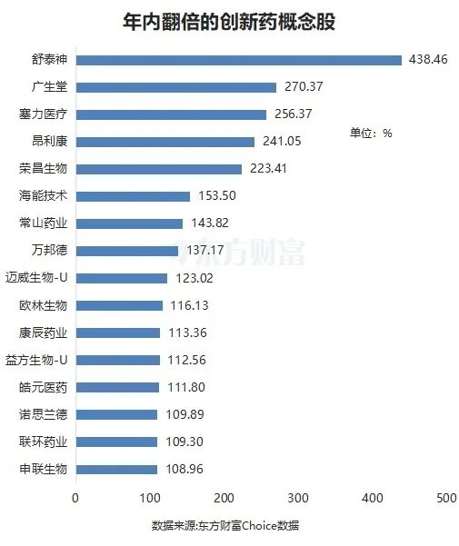 正因为如此,年内创新药板块成为A股的“明星板块”之一。今年以来(截至10月17日收盘),创新药板块指数累计上涨47.94%。板块中舒泰神成为“涨幅王”,年内涨幅438.46%。广生堂紧随其后,年内涨幅270.37%。整体而言,年内创新药板块有16股翻倍,上涨中位数达32.68%。