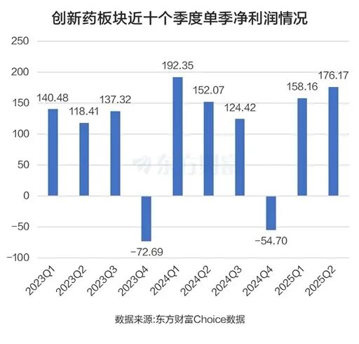 整个创新药板块来说,东方财富Choice数据显示,今年第二季度创新药板块实现归母净利润176.17亿元,同比增长15.85%,环比增长11.39%。