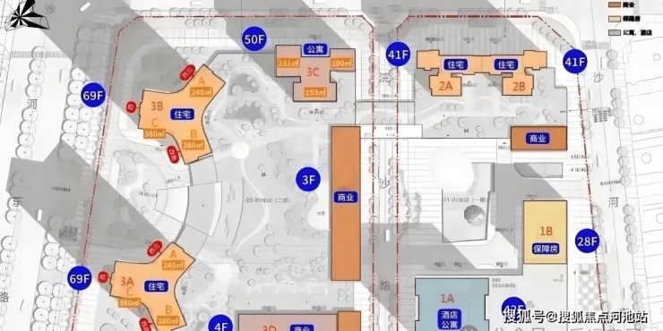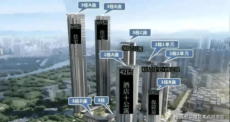 总栋数:8栋(1A栋42层酒店+公寓、1B栋28层保障房,2栋1/2单元41层住宅,3A/3B栋69层住宅;3C栋50层公寓、3D栋4层公寓)