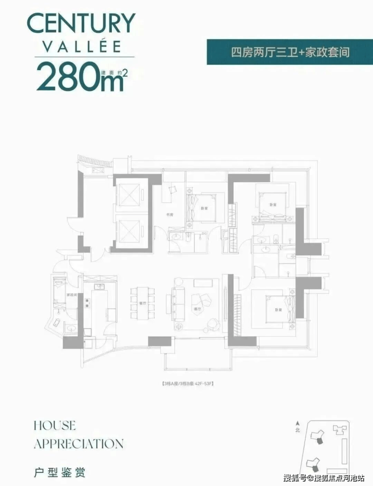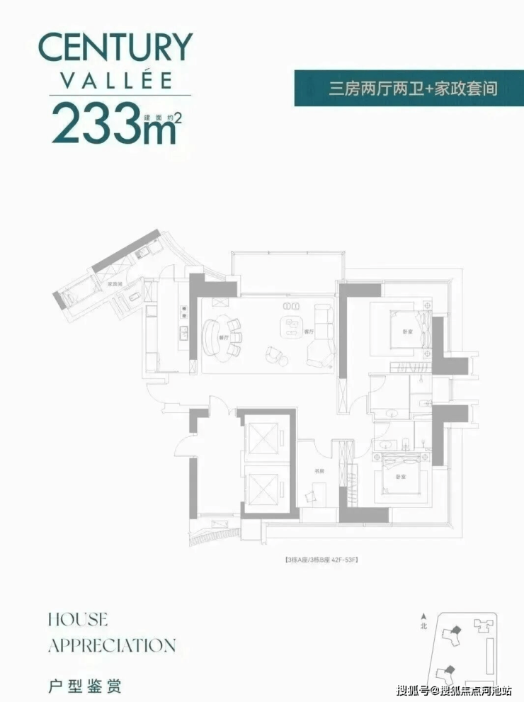 【约233㎡3+1房3卫】双梯入户,独立电梯厅,餐客大横厅贯通阳台,三面采光,主次卧尽享270°环幕视野,还有独立家政套间,西北朝向看名商和沙河高尔夫