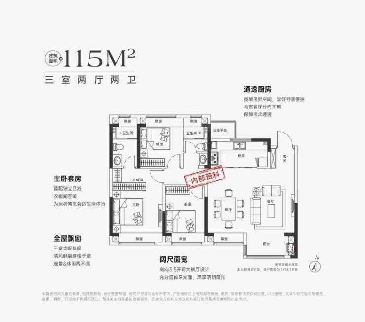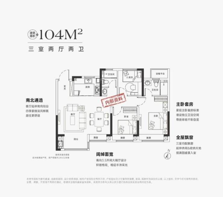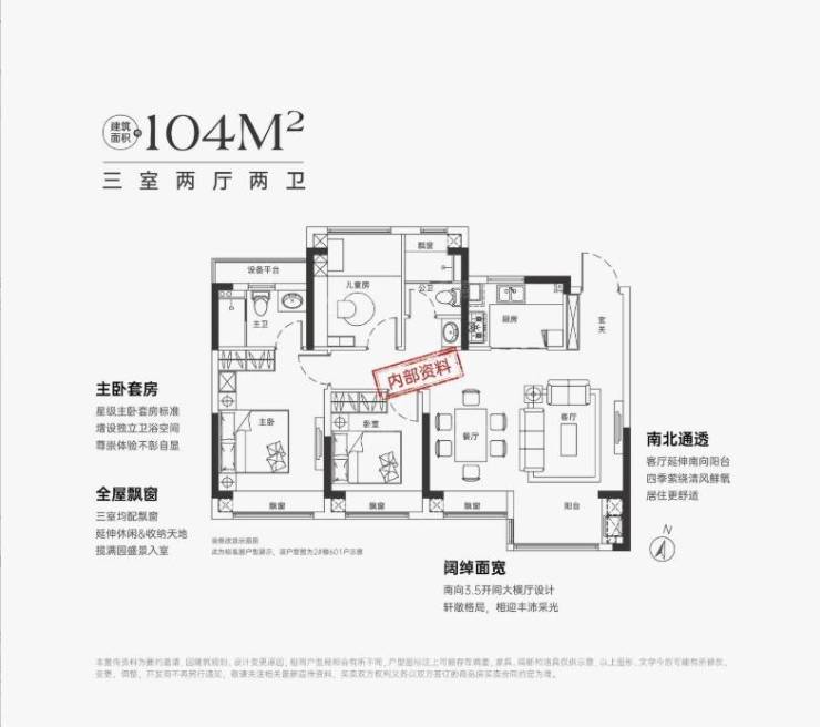 104㎡户型主要特点有:阔绰面宽、南北通透、全屋飘窗以及主卧套房设计。南向大面宽横厅,采光俱佳;南向3.5面宽大横厅设计,通透性好;三个卧室均配飘窗,增加空间感;主卧套房设计,独立卫浴空间。这些设计都体现了中煤·云庐书苑的舒适和实用性。
