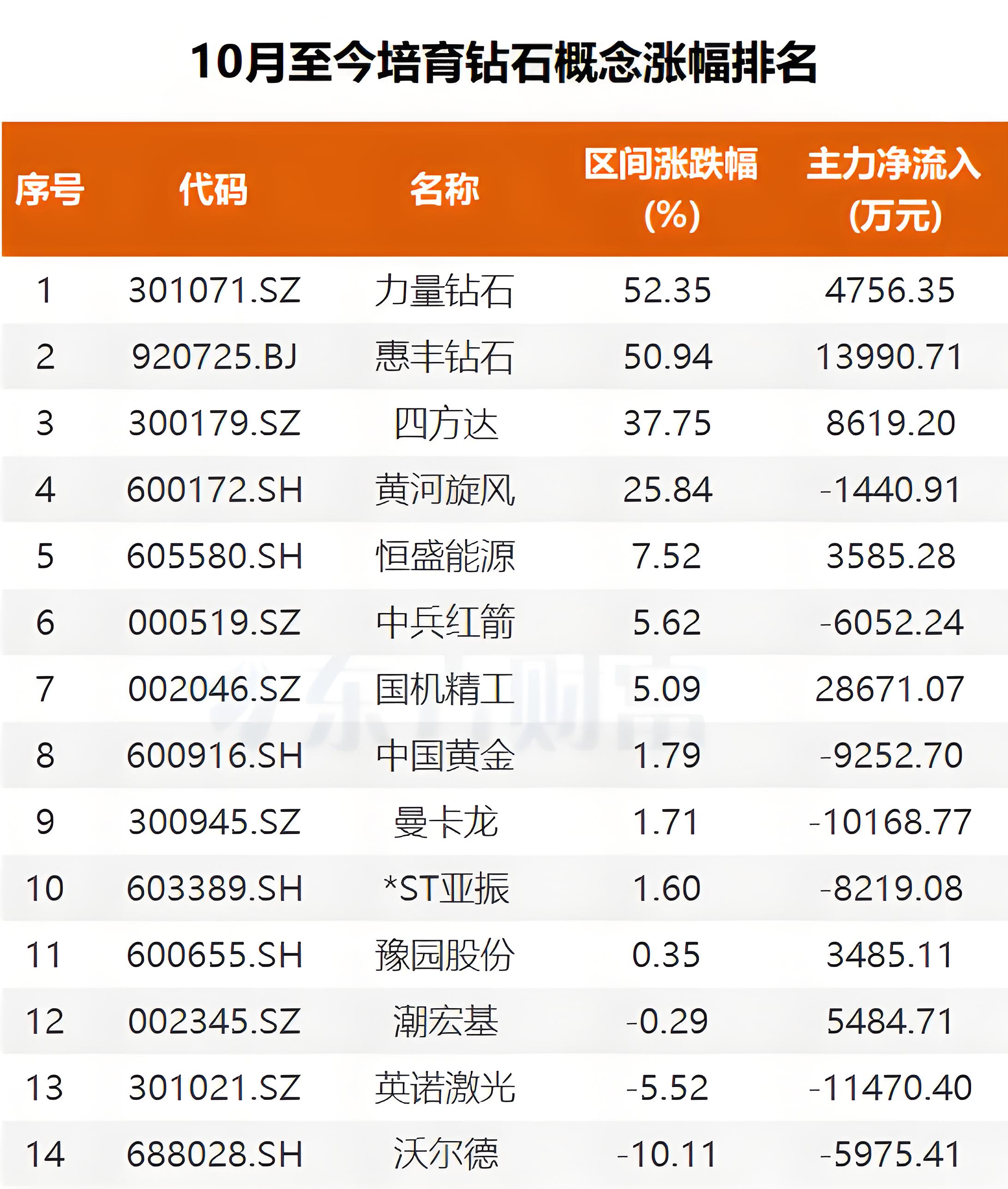 而个股涨幅与主力资金关注分不开,国机精工、惠丰钻石、四方达、力量钻石等个股10月以来获主力资金分别抢筹2.87亿元、1.40亿元、8619万元与4756万元。