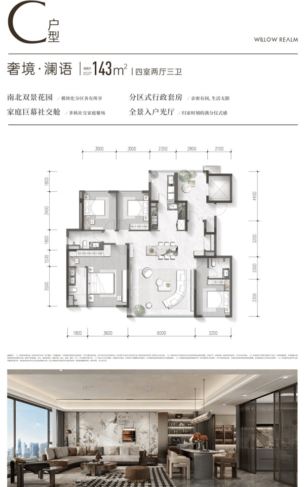 主力户型104-143㎡现代阔景平层,标准层高3.05米(商业底层除外),专属电梯厅入户设计
