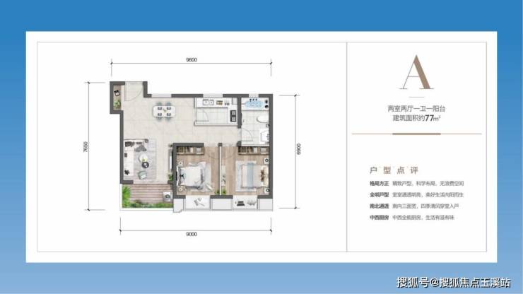 A户型:建筑面积约77㎡,两室两厅一卫一阳台