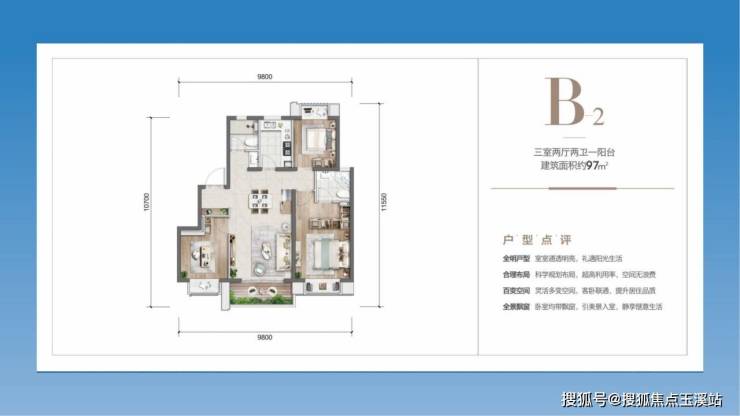 B2户型:建筑面积约97㎡,三室两厅两卫一阳台