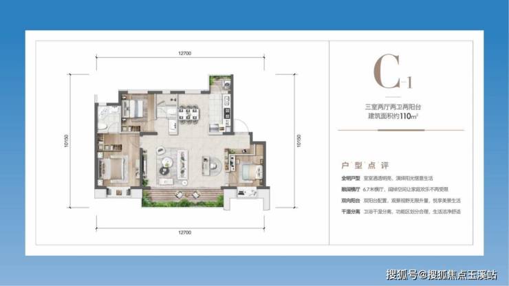 C1户型:建筑面积约110㎡,三室两厅两卫两阳台