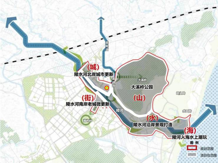 规划包含大溪岭公园(山)、陵河沿岸景观打造(水)、陵水河南岸老城微更新(街)、陵水河北岸城市更新(城)、陵河入海水上潮玩(海)五个子项目,整体项目依托陵水河开发,拟分为一期首开区、一期次开区、二期、三期四个阶段,傍山邻水望海瞰街,形成以美好栖居、商业服务、产业办公为主,集“山、水、街、城、海”功能规划于一体的滨水理想新城中心。