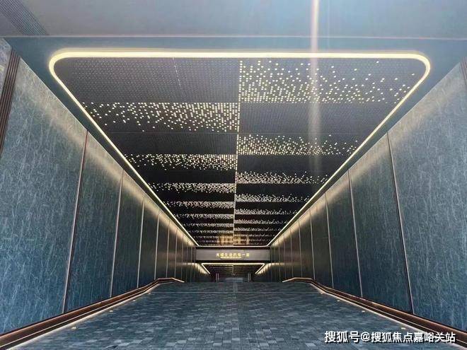 星空连廊的顶面采用香槟金铝板、上海大华星曜官方售楼处电话:400-8787-740√√√【已认证】墙面为爱马仕灰仿石砖,并镶嵌金属线条、就连地面都采用了夜里雪仿石砖