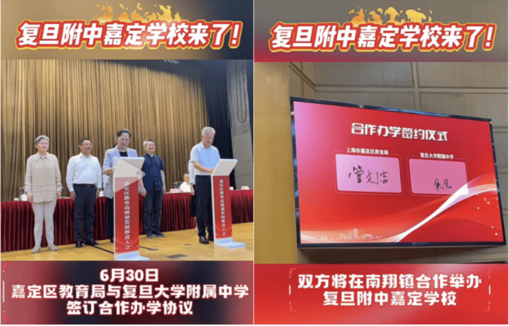 6月30日,嘉定区教育局与复旦附中签订合作办学协议,双方将在南翔镇举办复旦附中嘉定学校!