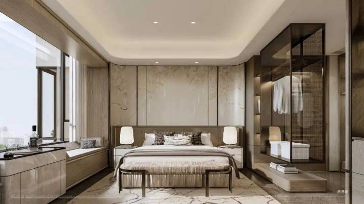 时代之城售楼处电话:400-1010-064✅✅主卧套房尤其吸睛!以270°转角飘窗打破传统空间边界,配合双台盆、大尺度衣帽间等顶配细节,将奢华居住体验浓缩于每一寸空间。飘窗台延伸出的休憩区与窗外景观形成对话,让私密时光也充满诗意。