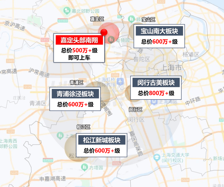 青浦徐泾,总价约600万级区域;宝山南大,总价约600万级区域;松江新城,总价约600万级区域;闵行古美,总价约800万级区域……