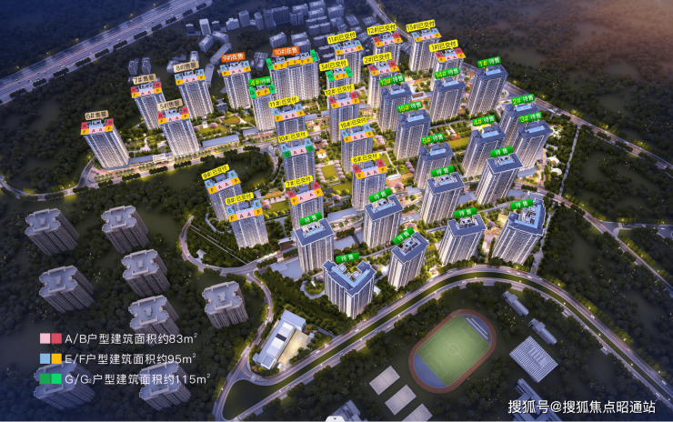在售户型:主推建面82-115㎡,含三居、四居及部分跃层