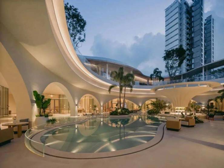 会所的立面采用了白色的曲线拱券造型,泳池从中穿过,蓝白相映,让人感受宁静而放松。作为国内首家使用迪拜风的社区会所,带来同纬度的气候和异域风情感,让住户的体验感再上一个阶层。
